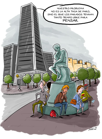 Decía Goethe, "Actuar es fácil, pensar es difícil; actuar según se piensa es aún más difícil." Y Francis Bacon apostilla, "Quien no quiere pensar es un fanático; quien no puede pensar, es un idiota; quien no osa pensar es un cobarde." Tal vez por eso no hay nada que más tema el establishment que el hecho de que la gente piense. ¿Y quién tiene más tiempo para pensar que un parado o una parada?... Claro que tener "tiempo para" pensar no significa que se vaya a "emplear en" pensar. Ciudadanos cobardes, fanáticos e idiotas, por desgracia, hay de sobra; y no sólo debido a iniciativa propia, también y sobre todo, a que los poderes de turno (políticos, económicos, religiosos, judiciales) ya se cuidan de crearlos y mantenerlos así. Radio, televisión, periódicos, leyes y reglamentos, educación reglada, normativas celestiales..., grandes inventos para que el rebaño no se levante, y el potencial pensador no enfile su mirada hacia la causa última de los problemas.